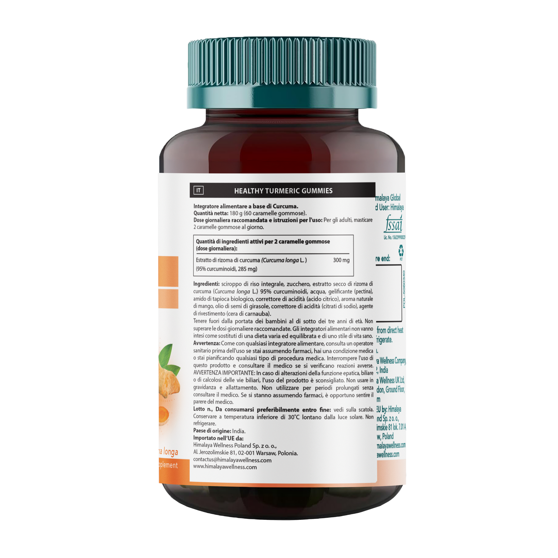 TURMERIC GUMMIES sono deliziose caramelle gommose prodotte da Himalaya Wellness, un'azienda che da oltre 95 anni combina la saggezza ayurvedica con la scienza moderna per creare integratori a base di erbe di alta qualità. La curcuma, superfood ayurvedico, ha un comprovato effetto positivo sul rafforzamento del sistema immunitario.
