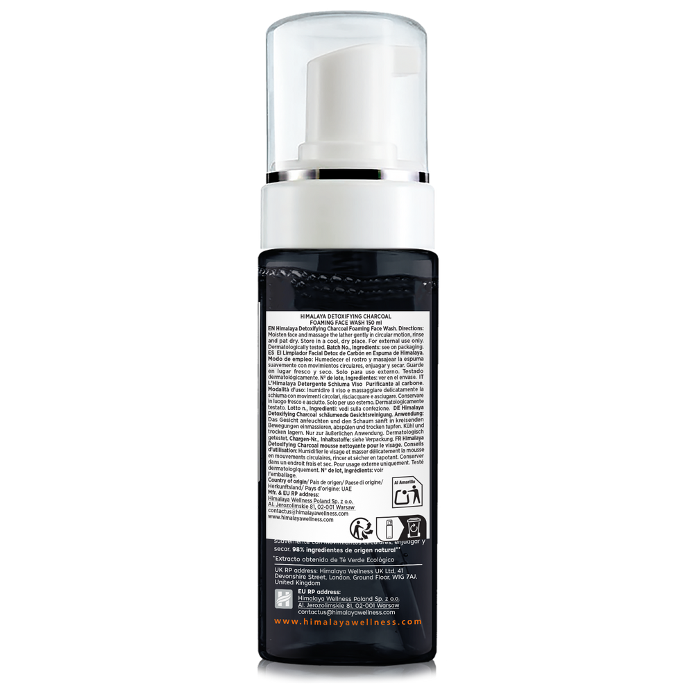 La Mousse Detergente Viso Himalaya Detox al Carbone Attivo è arricchito con Polvere di Carbone di Noce di Cocco e con le virtù del Tè Verde bio. Grazie alle proprietà assorbenti della Polvere di Carbone di Noce di Cocco, questa mousse detergente viso aiuta a rimuovere le particelle di sporco e a diminuire l'untuosità cutanea. Le proprietà antiossidanti del Tè Verde bio contribuiscono a purificare la pelle, lasciandola pulita e rigenerata. 98% di ingredienti di origine naturale.