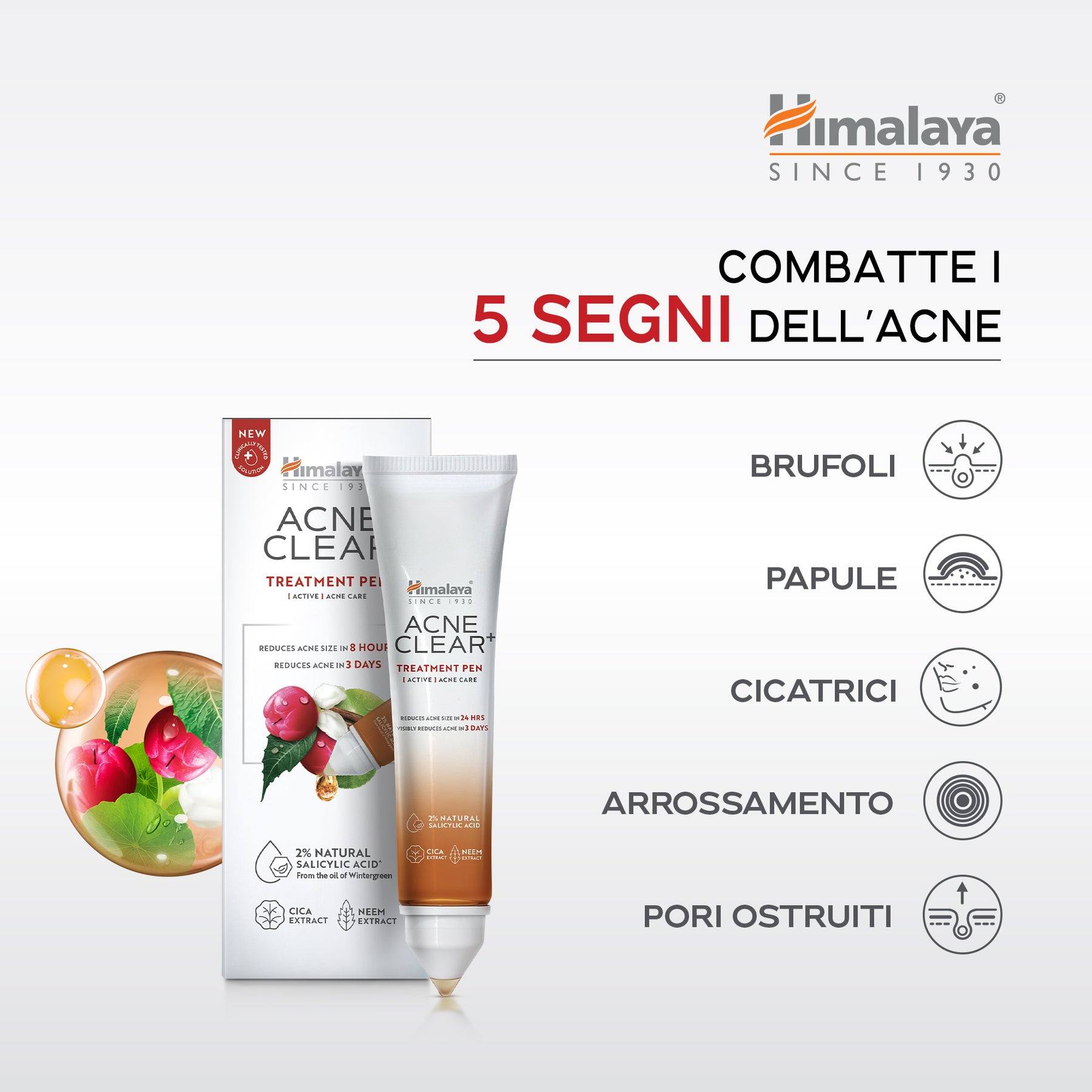 - Agisce contro i 5 segni dell'acne: eccesso di sebo, brufoli, arrossamenti, pori ostruiti e macchie.