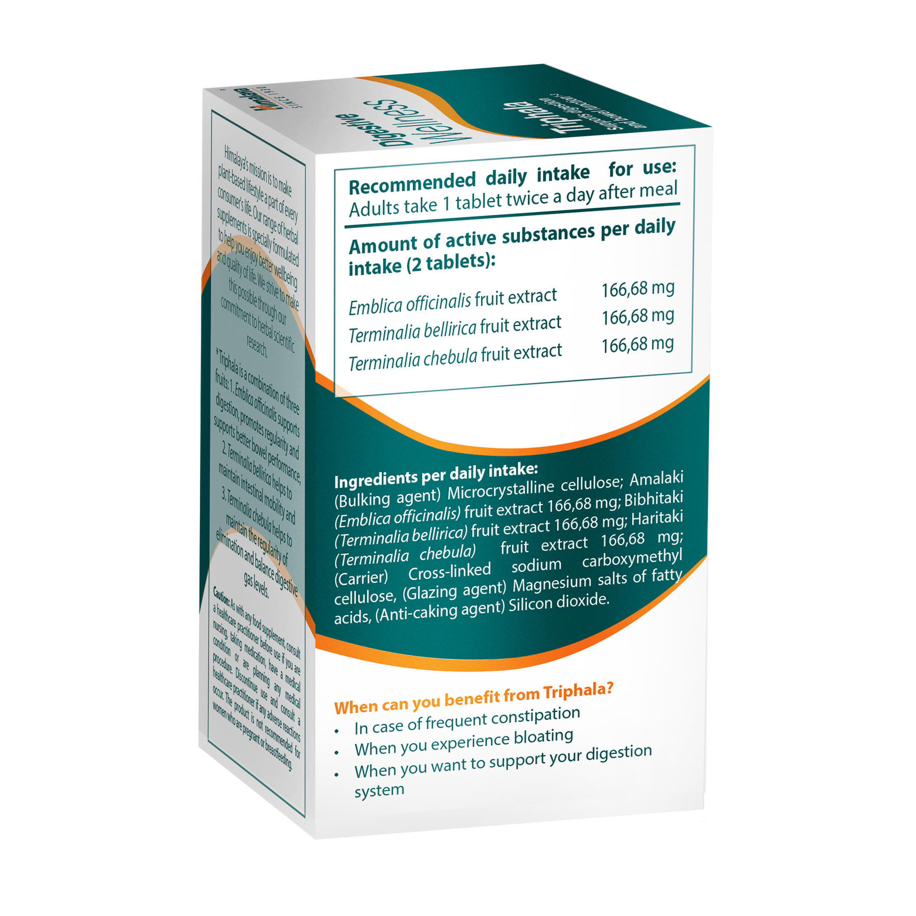 - TRE FRUTTI E UN MIGLIORE EQUILIBRIO – Ogni compressa contiene polvere di Triphala: una miscela di Emblica officinalis, Terminalia bellirica e Terminalia chebula, erbe da tempo usate per la funzione intestinale e la regolarità, alleviando il gonfiore.